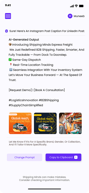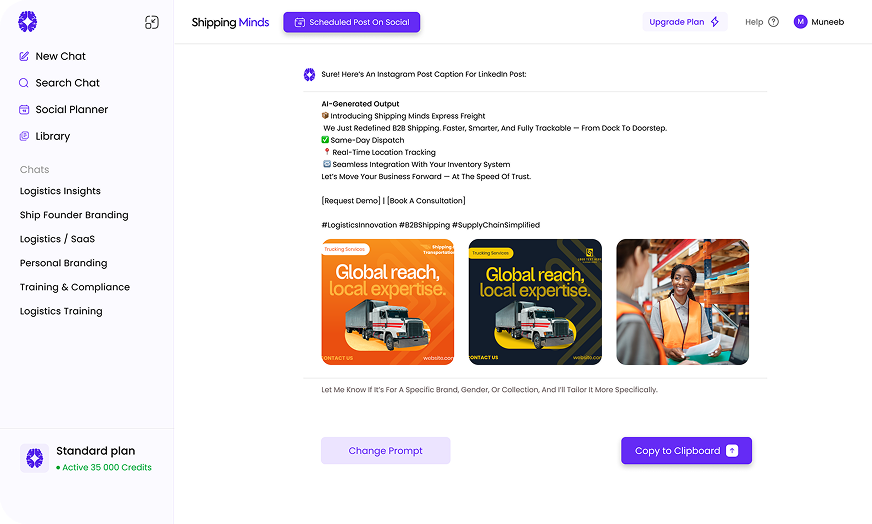 Shipping Minds was implemented as a centralized AI-powered content and shipping hub that brought strategy, creation, and scheduling into one system. The platform enabled the team to generate high-quality, brand-aligned content using AI, plan campaigns in advance